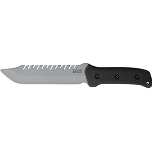 Product Description : SCAR Blades - Gray Finish Liberator Fixed Blade Knife with Black Handles. Model: SCAR002. 13 1/4" overall. 7 3/8" gray finish sawback blade. Full tang. Black handle. Black sheath. SCAR Blades are custom hand built knives produced in the U.S.A. They are designed to be used as rugged tools to assist military, law enforcement, and avid outdoorsmen to survive in the field, even in the most harsh conditions. Most SCAR Blades knives are full tang and are made from 3/16" thick 1095 high carbon alloy, which is heat treated for hardness only along the sharpened edge - creating a RC hardness of 58, while leaving the spine of the blade softer to absorb the stresses of high impact chopping. Blades have a powder coated finish and come with a non-slip phenolic handle to ensure a sure grip. Sheaths are individually made using Kydex, which is tightly formed around each individual knife for a secure fit. The sheaths are equipped with either a rotating belt loop allowing the sheath to swivel 360 degrees, moving with the user or a stationary loop for added strength and security. Multi-attachment holes are located around the sheath, to allow the knife to be adjusted and placed anywhere the user requires.