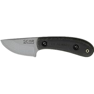 Product Description : : SCAR Blades - Gray Finish Lil Hornet Fixed Blade Knife with Black Handles. Model: SCAR062. 7" overall. 3 1/4" gray finish blade. Full tang. Black handle. Black sheath. SCAR Blades are custom hand built knives produced in the U.S.A. They are designed to be used as rugged tools to assist military, law enforcement, and avid outdoorsmen to survive in the field, even in the most harsh conditions. Most SCAR Blades knives are full tang and are made from 3/16" thick 1095 high carbon alloy, which is heat treated for hardness only along the sharpened edge - creating a RC hardness of 58, while leaving the spine of the blade softer to absorb the stresses of high impact chopping. Blades have a powder coated finish and come with a non-slip phenolic handle to ensure a sure grip. Sheaths are individually made using Kydex, which is tightly formed around each individual knife for a secure fit. The sheaths are equipped with either a rotating belt loop allowing the sheath to swivel 360 degrees, moving with the user or a stationary loop for added strength and security. Multi-attachment holes are located around the sheath, to allow the knife to be adjusted and placed anywhere the user requires.