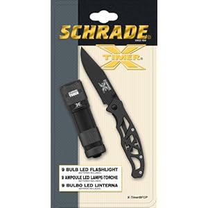 Category: Sports & Outdoors Vendor: AAA batteries and lanyard Included Black folding lockback knife 9-bulb LED flashlight Batteries included Limited Lifetime Product Description : Schrade X-Timer folding knife with LED Flashlight.